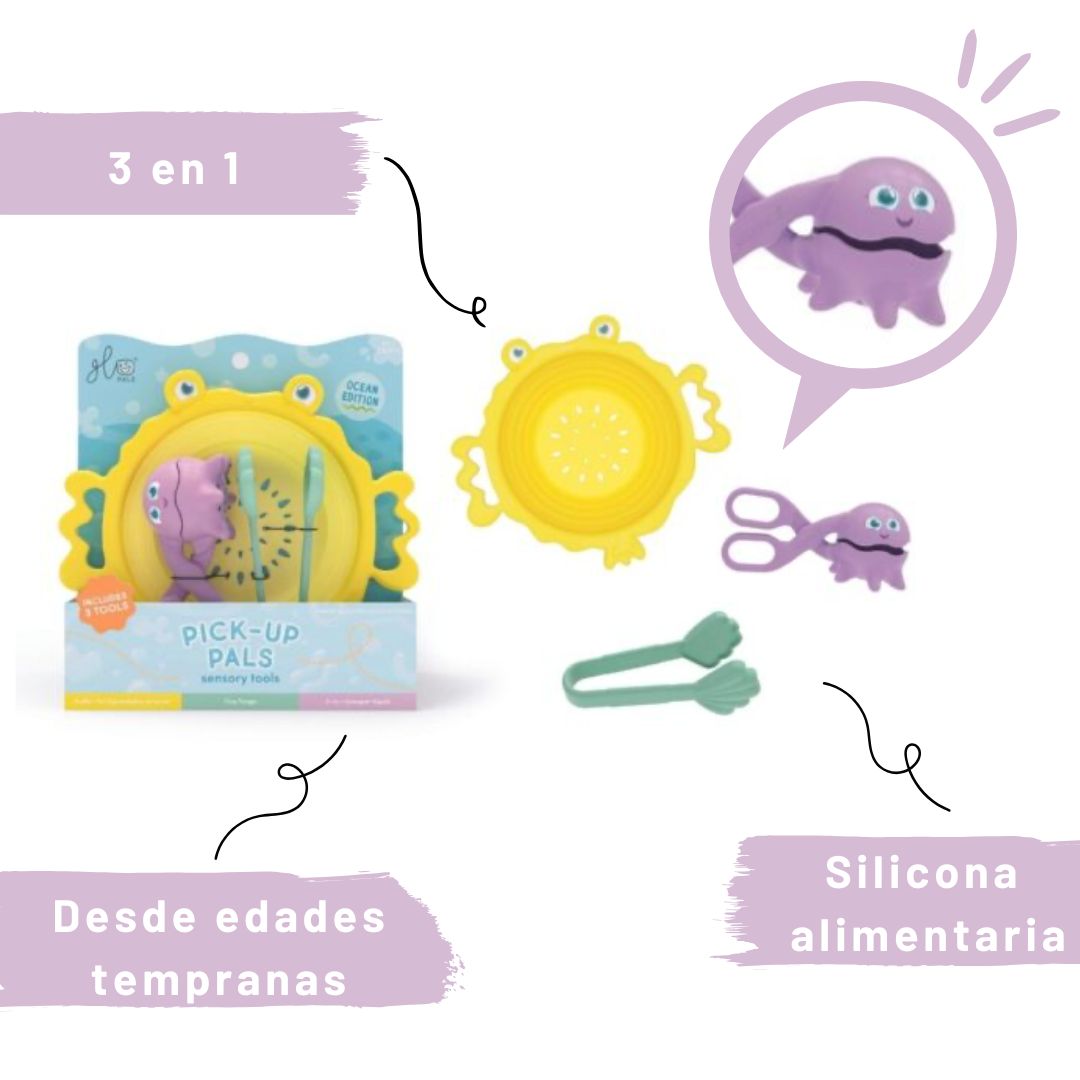 ¡Descubre el mundo sensorial con Pick Up Pals! Este set incluye tres encantadoras herramientas diseñadas para recoger, colar y tamizar, perfectas para mesas sensoriales y juegos con frascos de exploración. Fabricados en silicona de grado médico. ¡Un mundo de descubrimientos al alcance de los más pequeños!