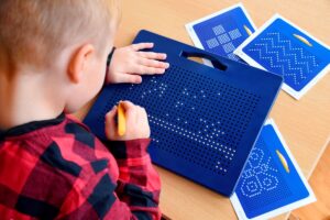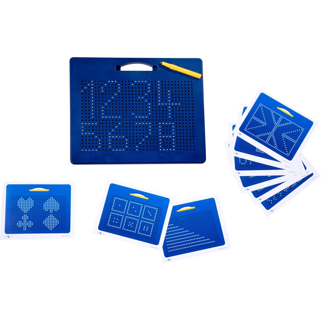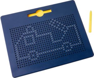 La Pizarra Magnética para Escribir convierte el gesto de trazar en una experiencia manipulativa, visual y altamente motivadora. Con ayuda del pasador magnético, las pequeñas bolas metálicas emergen con un “clic” desde el interior del tablero, permitiendo crear patrones, letras, números o dibujos.