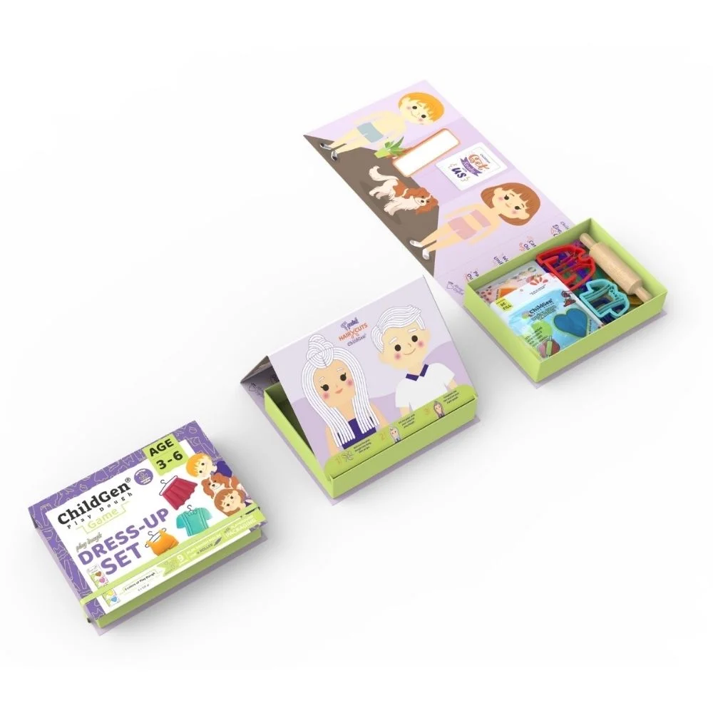 Juego para modelar DRESS-UP. Su divertida caja con diferentes modos de juego, rodillo de madera, 6 moldes y 5 bolsas de plastilina natural con cierre zip, en color rojo, azul, marrón, amarillo y naranja te harán disfrutar de una actividad divertida y educativa.