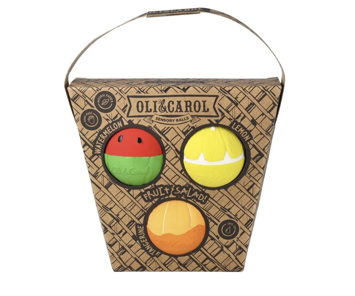 El set de bolas sensoriales/ mordedores incluye tres mini bolitas sensoriales inspiradas en frutas irresistibles: una refrescante sandía, un limón amargo y una mandarina dulce. Diseñadas especialmente para manos pequeñas, estimulan la curiosidad y los sentidos del bebé a través del agarre, la mordida y el juego libre.